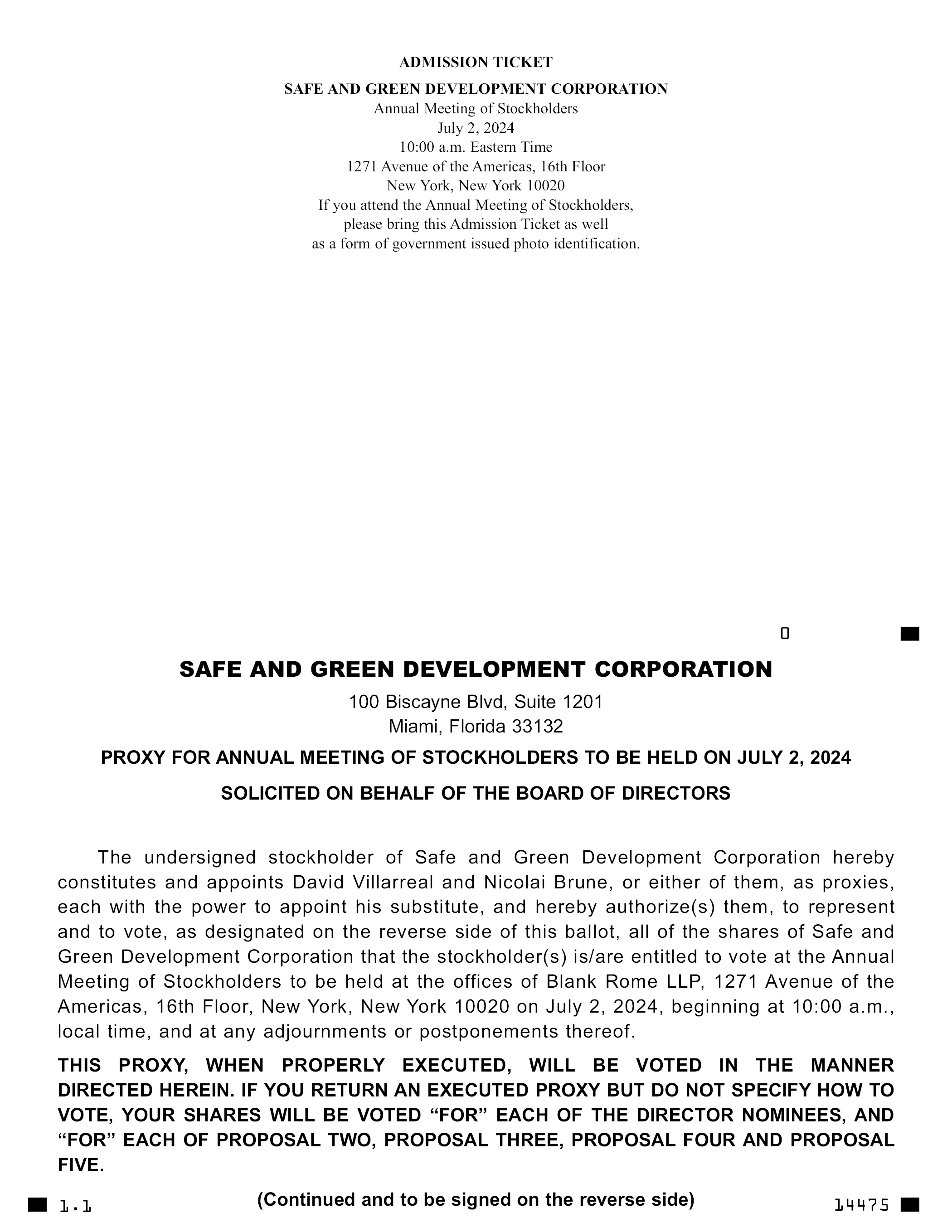 YOUR VOTE IS IMPORTANT. WHETHER OR NOT YOU PLAN TO ATTEND THE 2024 ANNUAL MEETING, PLEASE SUBMIT A PROXY TO HAVE YOUR SHARES VOTED AS PROMPTLY AS POSSIBLE BY SUBMITTING YOUR PROXY VIA THE INTERNET OR TELEPHONE OR BY SIGNING, DATING AND RETURNING BY MAIL THE PROXY CARD ENCLOSED WITH THE PROXY MATERIALS. IF YOU DO NOT RECEIVE THE PROXY MATERIALS IN PRINTED FORM AND WOULD LIKE TO SUBMIT A PROXY BY MAIL, YOU MAY REQUEST A PRINTED COPY OF THE PROXY MATERIALS (INCLUDING THE PROXY) AND SUCH MATERIALS WILL BE SENT TO YOU BY CONTACTING THE CORPORATE SECRETARY, SAFE AND GREEN DEVELOPMENT CORPORATION, 100 BISCAYNE BLVD., SUITE 1201, MIAMI, FLORIDA 33132, OR BY PHONE AT (904) 496-0027.