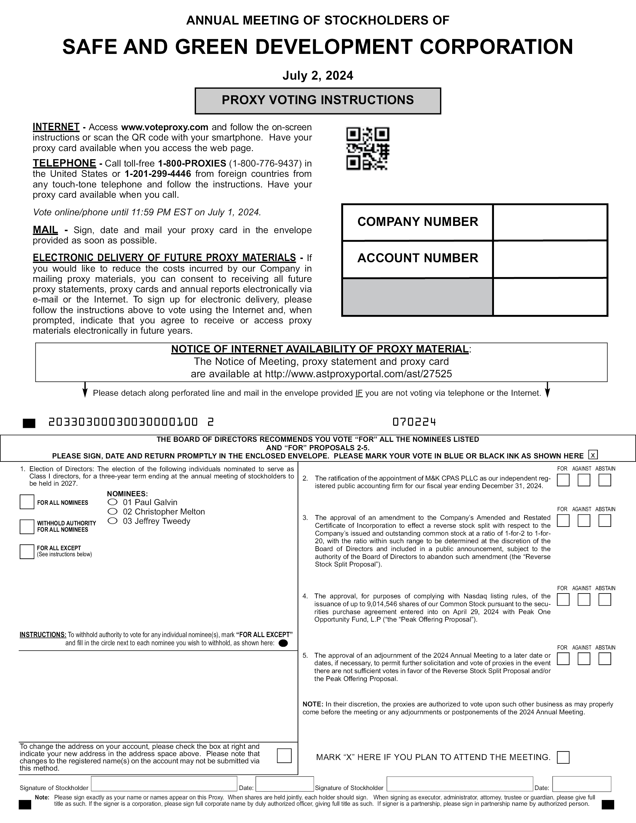 ANNUAL MEETING OF STOCKHOLDERS OF SAFE AND GREEN DEVELOPMENT CORPORATION July 2, 2024 PROXY VOTING INSTRUCTIONS INTERNET - Access www.voteproxy.com and follow the on-screen instructions or scan the QR code with your smartphone. Have your proxy card available when you access the web page. TELEPHONE - Call toll-free 1-800-PROXIES (1-800-776-9437) in the United States or 1-201-299-4446 from foreign countries from any touch-tone telephone and follow the instructions. Have your proxy card available when you call. Vote online/phone until 11:59 PM EST on July 1, 2024. MAIL - Sign, date and mail your proxy card in the envelope provided as soon as possible. ELECTRONIC DELIVERY OF FUTURE PROXY MATERIALS - If you would like to reduce the costs incurred by our Company in mailing proxy materials, you can consent to receiving all future proxy statements, proxy cards and annual reports electronically via e-mail or the Internet. To sign up for electronic delivery, please follow the instructions above to vote using the Internet and, when prompted, indicate that you agree to receive or access proxy materials electronically in future years. COMPANY NUMBER ACCOUNT NUMBER NOTICE OF INTERNET AVAILABILITY OF PROXY MATERIAL: The Notice of Meeting, proxy statement and proxy card are available at http://www.astproxyportal.com/ast/27525 Please detach along perforated line and mail in the envelope provided IF you are not voting via telephone or the Internet. 20330300030030000100 2 070224 THE BOARD OF DIRECTORS RECOMMENDS YOU VOTE “FOR” ALL THE NOMINEES LISTED AND “FOR” PROPOSALS 2-5. PLEASE SIGN, DATE AND RETURN PROMPTLY IN THE ENCLOSED ENVELOPE. PLEASE MARK YOUR VOTE IN BLUE OR BLACK INK AS SHOWN HERE JOHN SMITH 1234 MAIN STREET APT. 203 NEW YORK, NY 10038 INSTRUCTIONS: To withhold authority to vote for any individual nominee(s), mark “FOR ALL EXCEPT” and fill in the circle next to each nominee you wish to withhold, as shown here: 01 Paul Galvin 02 Christopher Melton 03 Jeffrey Tweedy FOR ALL NOMINEES WITHHOLD AUTHORITY FOR ALL NOMINEES FOR ALL EXCEPT (See instructions below) NOMINEES: 1. Election of Directors: The election of the following individuals nominated to serve as Class I directors, for a three-year term ending at the annual meeting of stockholders to be held in 2027. MARK “X” HERE IF YOU PLAN TO ATTEND THE MEETING. 2. The ratification of the appointment of M&K CPAS PLLC as our independent registered public accounting firm for our fiscal year ending December 31, 2024. 3. The approval of an amendment to the Company’s Amended and Restated Certificate of Incorporation to effect a reverse stock split with respect to the Company’s issued and outstanding common stock at a ratio of 1-for-2 to 1-for- 20, with the ratio within such range to be determined at the discretion of the Board of Directors and included in a public announcement, subject to the authority of the Board of Directors to abandon such amendment (the “Reverse Stock Split Proposal”). 4. The approval, for purposes of complying with Nasdaq listing rules, of the issuance of up to 9,014,546 shares of our Common Stock pursuant to the securities purchase agreement entered into on April 29, 2024 with Peak One Opportunity Fund, L.P (“the “Peak Offering Proposal”). 5. The approval of an adjournment of the 2024 Annual Meeting to a later date or dates, if necessary, to permit further solicitation and vote of proxies in the event there are not sufficient votes in favor of the Reverse Stock Split Proposal and/or the Peak Offering Proposal. NOTE: In their discretion, the proxies are authorized to vote upon such other business as may properly come before the meeting or any adjournments or postponements of the 2024 Annual Meeting. FOR AGAINST ABSTAIN FOR AGAINST ABSTAIN FOR AGAINST ABSTAIN FOR AGAINST ABSTAIN To change the address on your account, please check the box at right and indicate your new address in the address space above. Please note that changes to the registered name(s) on the account may not be submitted via this method. MARK “X” HERE IF YOU PLAN TO ATTEND THE MEETING. Signature of Stockholder Date: Signature of Stockholder Date: Note: Please sign exactly as your name or names appear on this Proxy. When shares are held jointly, each holder should sign. When signing as executor, administrator, attorney, trustee or guardian, please give full title as such. If the signer is a corporation, please sign full corporate name by duly authorized officer, giving full title as such. If signer is a partnership, please sign in partnership name by authorized person.
