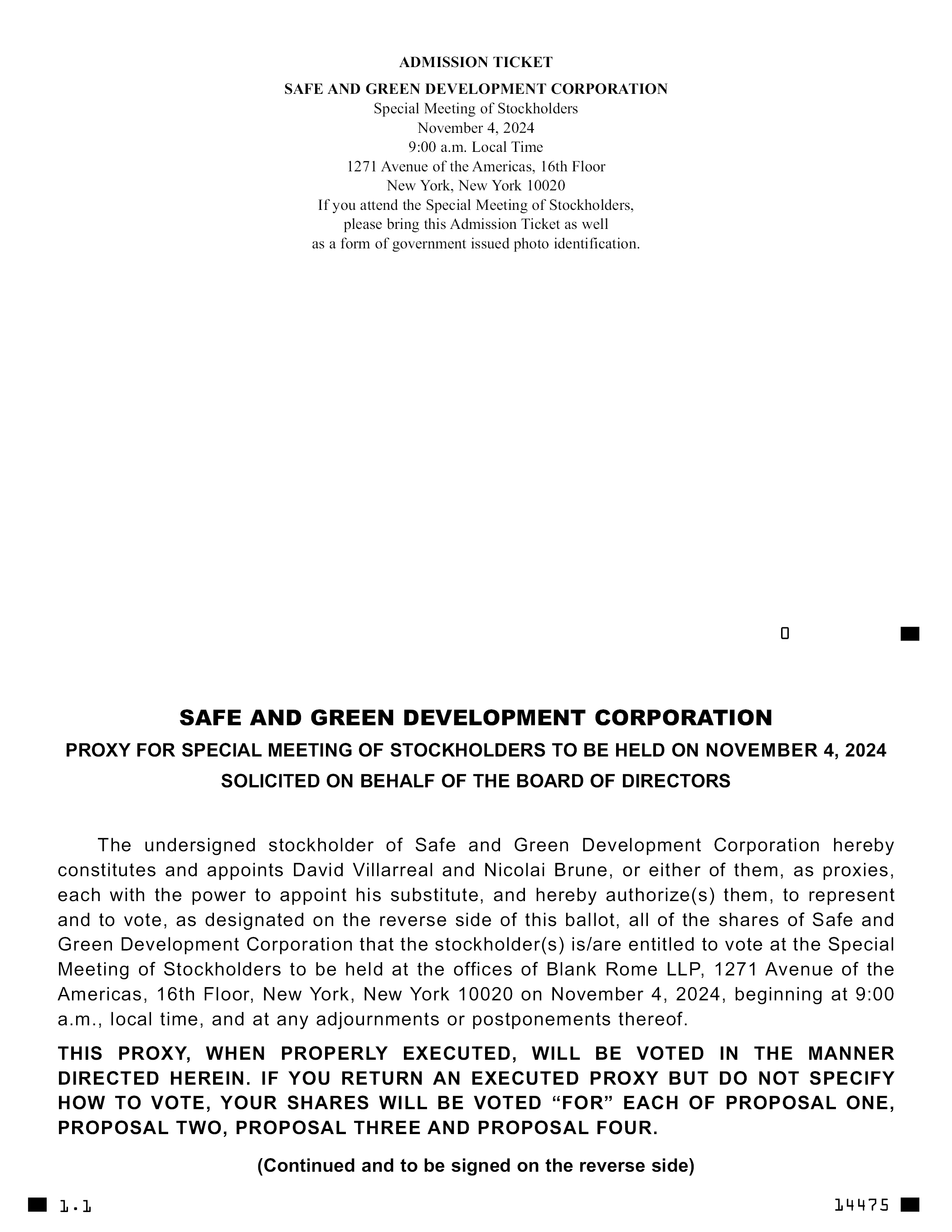 ADMISSION TICKET SAFE AND GREEN DEVELOPMENT CORPORATION Special Meeting of Stockholders November 4, 2024 9:00 a.m. Local Time 1271 Avenue of the Americas, 16th Floor New York, New York 10020 If you attend the Special Meeting of Stockholders, please bring this Admission Ticket as well as a form of government issued photo identification. SAFE AND GREEN DEVELOPMENT CORPORATION PROXY FOR SPECIAL MEETING OF STOCKHOLDERS TO BE HELD ON NOVEMBER 4, 2024 SOLICITED ON BEHALF OF THE BOARD OF DIRECTORS The undersigned stockholder of Safe and Green Development Corporation hereby constitutes and appoints David Villarreal and Nicolai Brune, or either of them, as proxies, each with the power to appoint his substitute, and hereby authorize(s) them, to represent and to vote, as designated on the reverse side of this ballot, all of the shares of Safe and Green Development Corporation that the stockholder(s) is/are entitled to vote at the Special Meeting of Stockholders to be held at the offices of Blank Rome LLP, 1271 Avenue of the Americas, 16th Floor, New York, New York 10020 on November 4, 2024, beginning at 9:00 a.m., local time, and at any adjournments or postponements thereof. THIS PROXY, WHEN PROPERLY EXECUTED, WILL BE VOTED IN THE MANNER DIRECTED HEREIN. IF YOU RETURN AN EXECUTED PROXY BUT DO NOT SPECIFY HOW TO VOTE, YOUR SHARES WILL BE VOTED “FOR” EACH OF PROPOSAL ONE, PROPOSAL TWO, PROPOSAL THREE AND PROPOSAL FOUR. (Continued and to be signed on the reverse side)